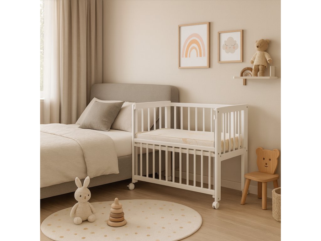 Kolečka ani matrace nejsou součástí postýlky a musí se objednat zvlášť.