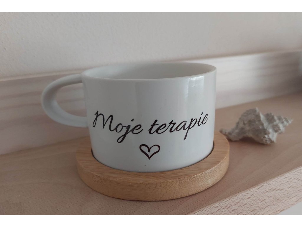 Designový hrneček makronka a bambusovým podšálkem nápisem Moje terapie