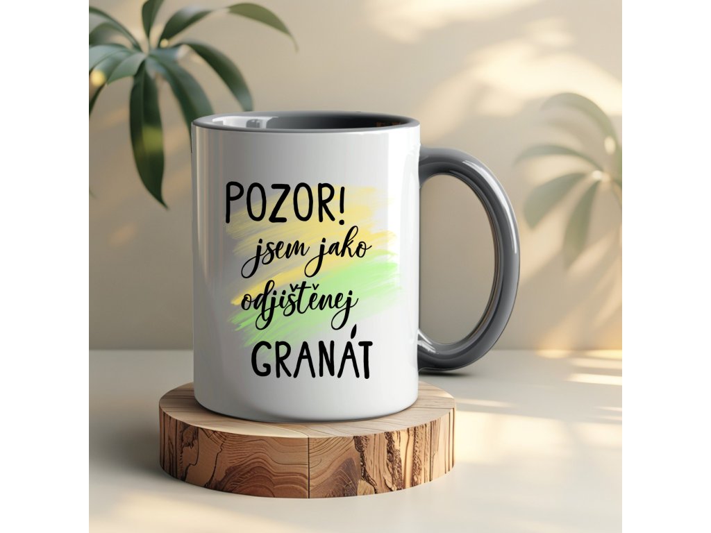 Originální potištěný keramický hrneček 330ml s vtipným textem "Pozor, jsem jako odjištěný granát"