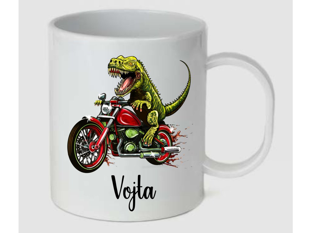 Originální bílý keramický hrnek s obrázkem t-rexe na mororcea se jménem dle Vašeho přání.