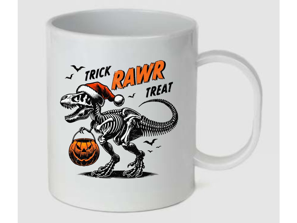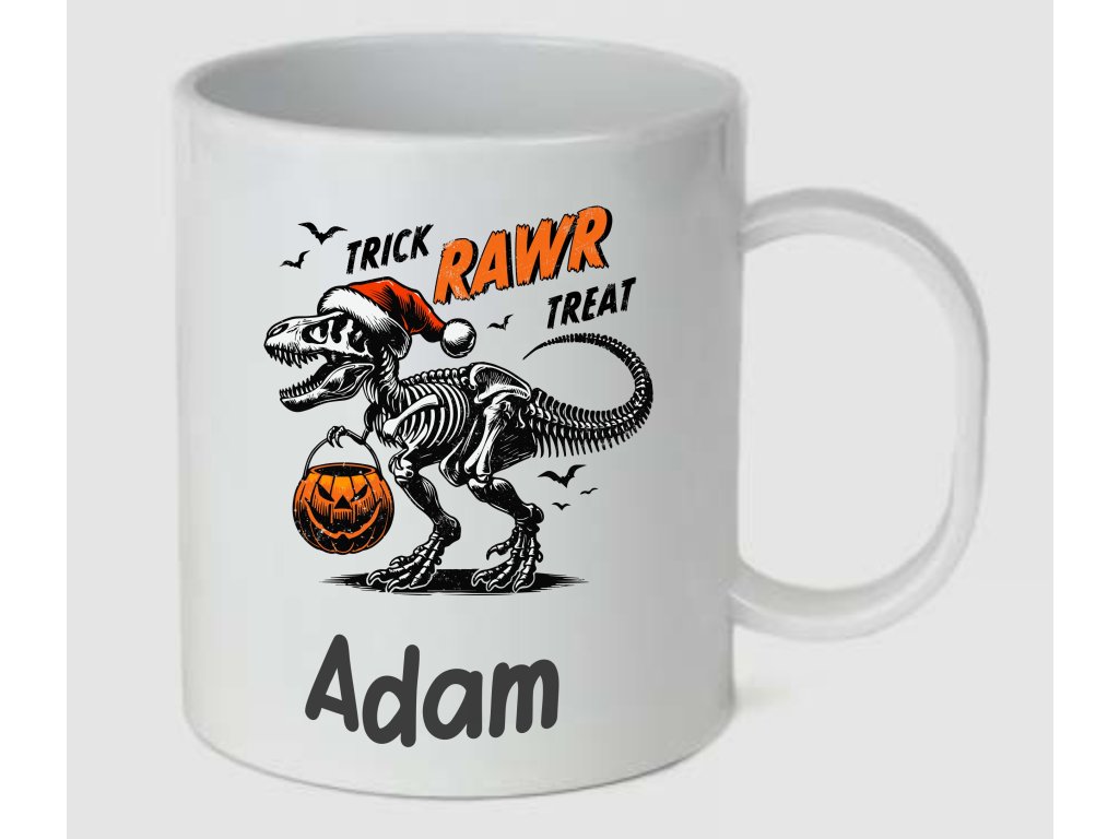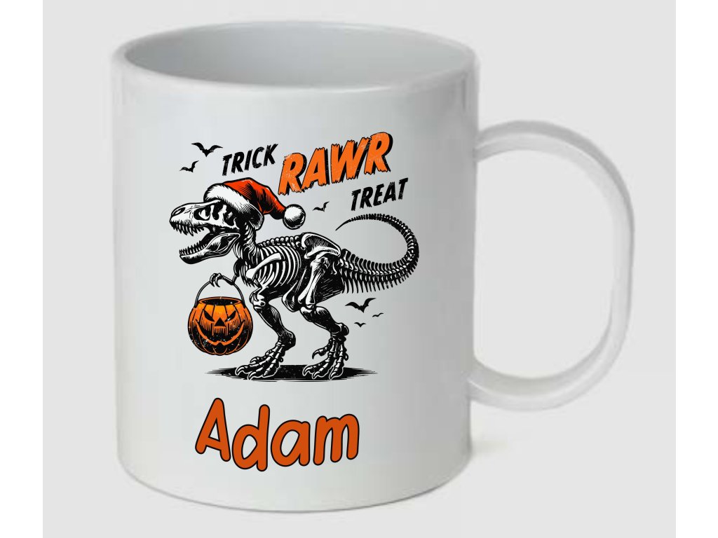 Originální Halloweenský bílý keramický hrnek s obrázkem t-Rexe se jménem dle Vašeho přání.
