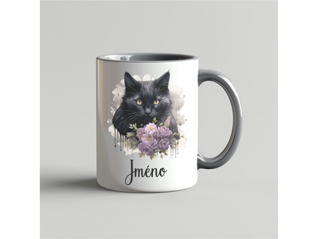 Originální potištěný šedý hrnek 330ml se jménem a obrázkem kočičky
