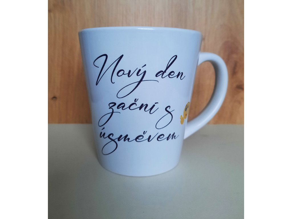 Originální kónický hrnek nejen na latté s textem "Nový den začni s úsměvem"