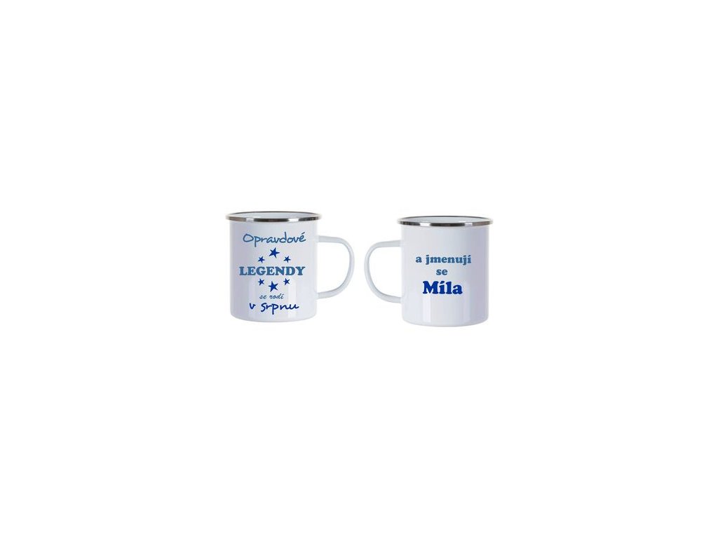 Bílý smaltovaný plecháček s nápisem " Opravdové legendy se rodí v ... a jmenují se ... Jméno a měsíc doplníme dle Vašeho přání. Změnit můžeme barvu textu nebo věnováním a pod.