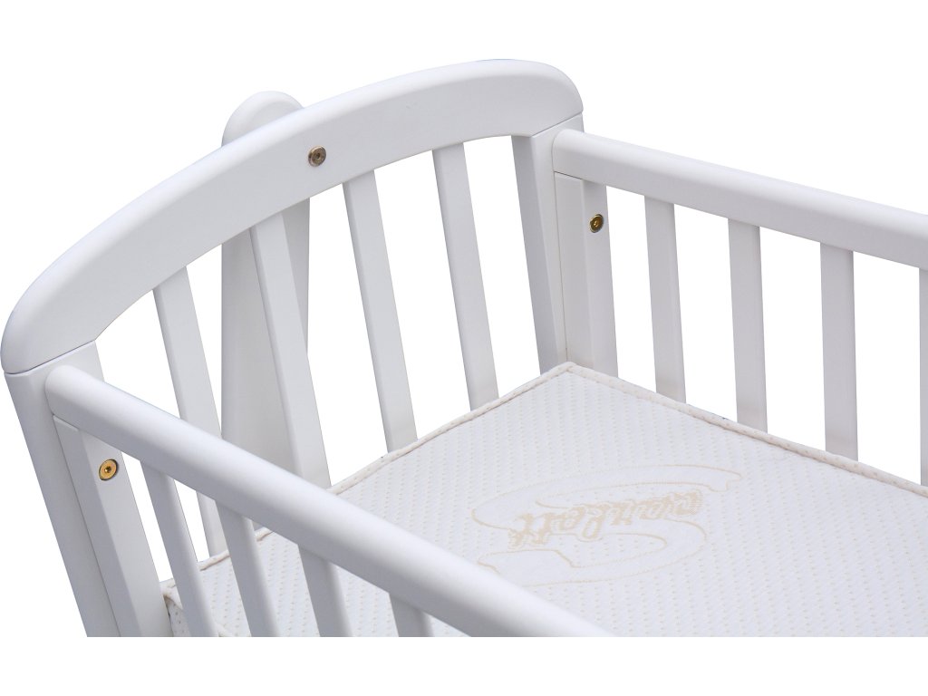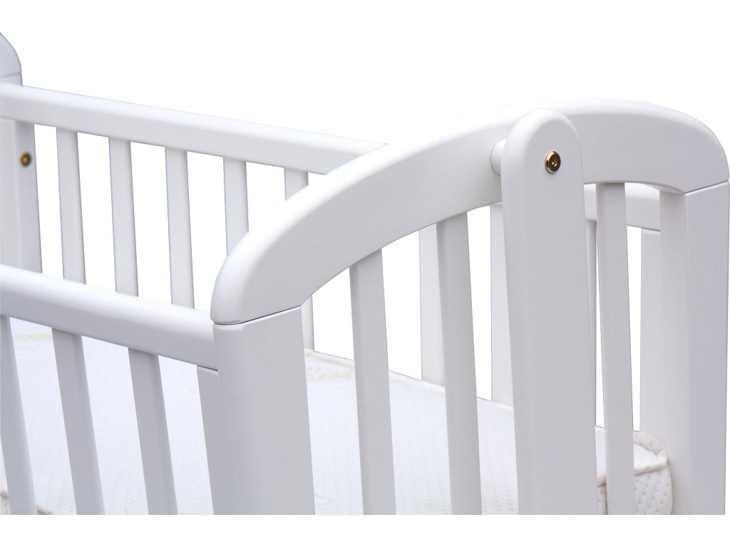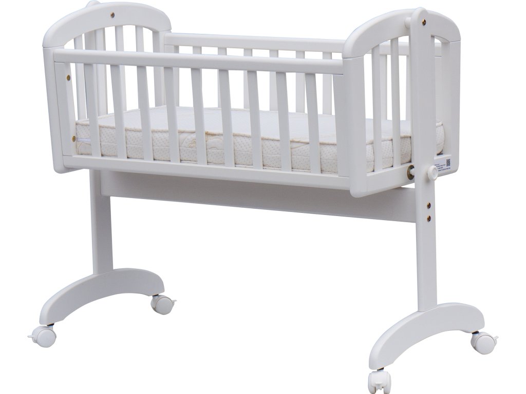 Krásná bílá kolébka z březového dřeva je ideální pro usínání miminek.