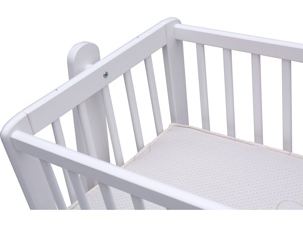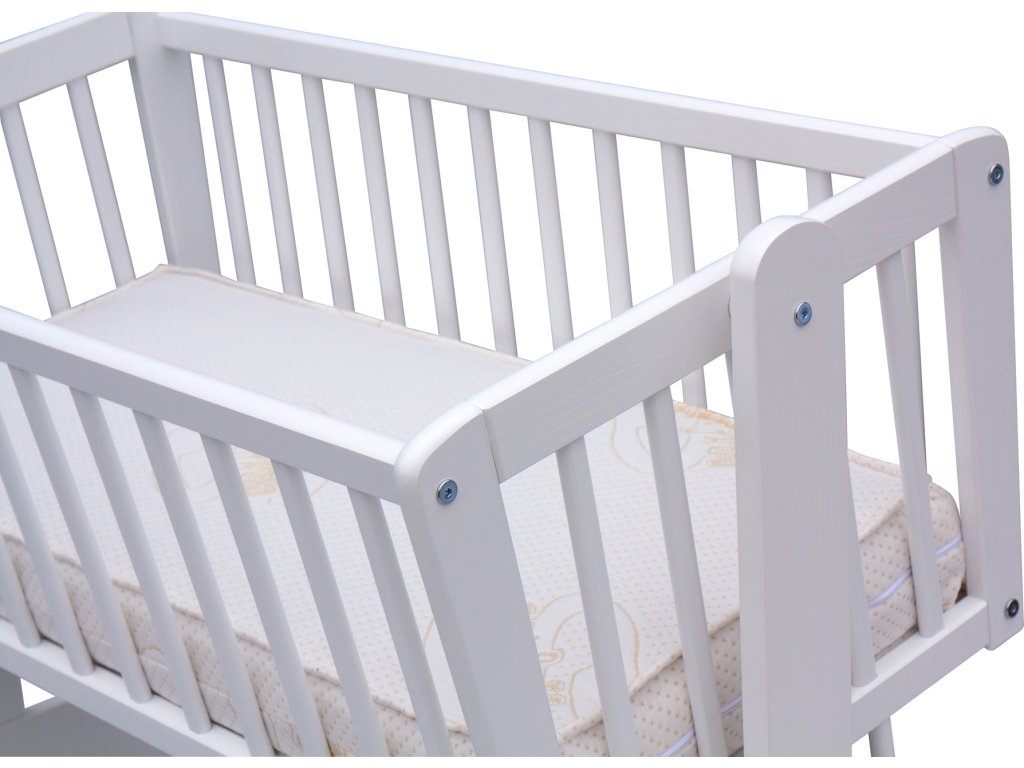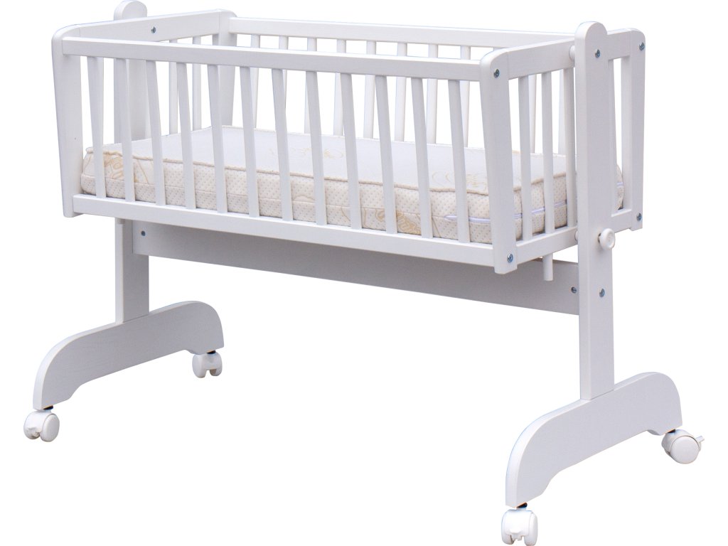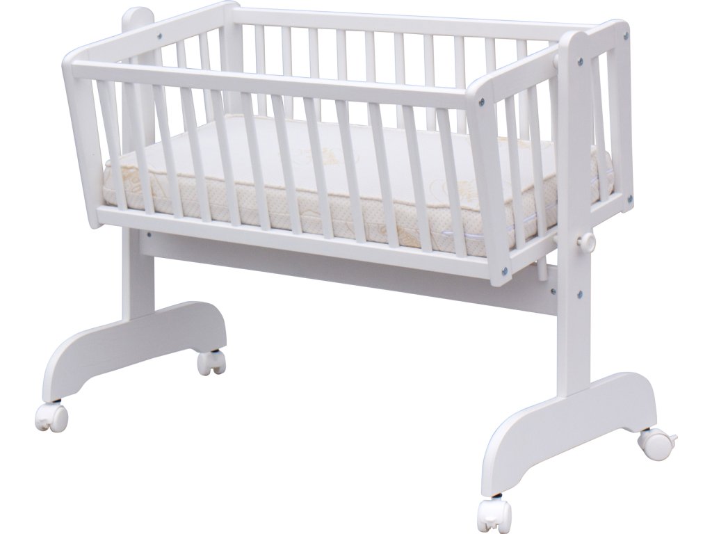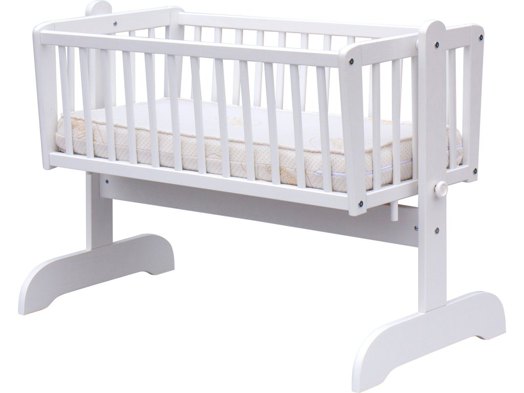 Krásná bílá kolébka z borovicového dřeva je ideální pro usínání miminek.