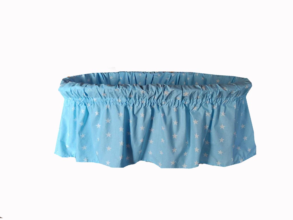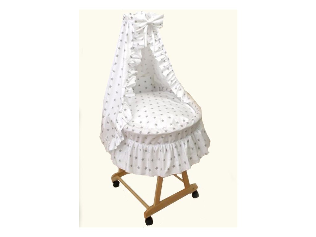Koš je včetně povlečení a konstrukce na nebesa. Koš je na kolečkách usnadňuje mamince přejíždět z místnosti do místnosti.