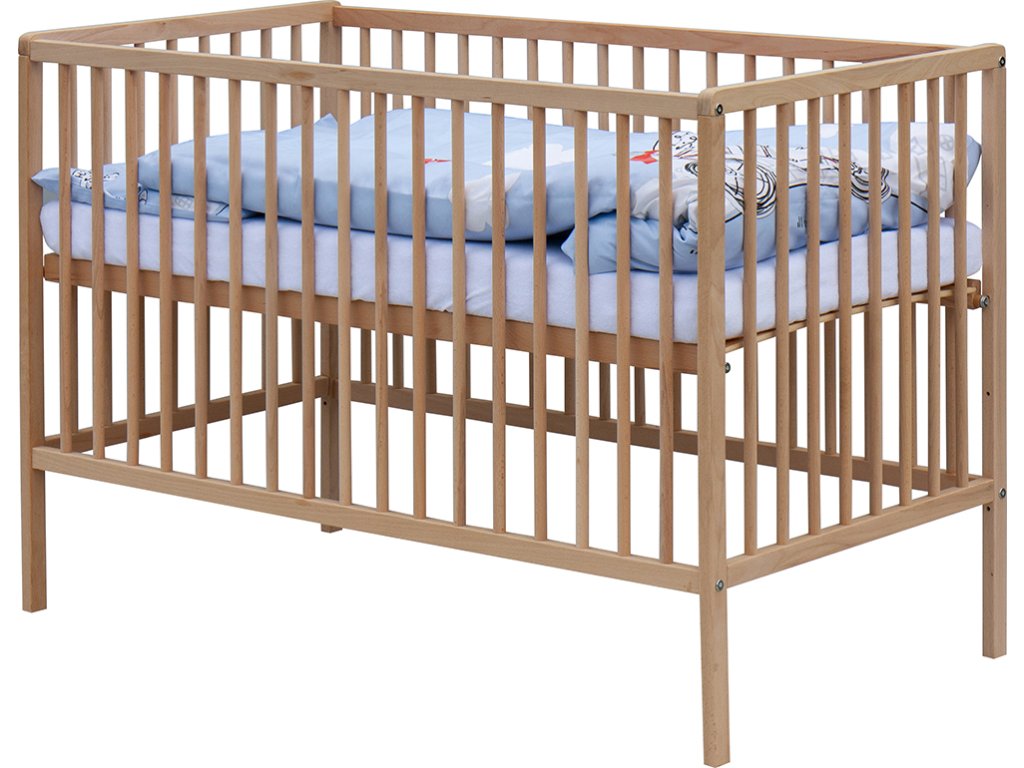 1. Dětská dřevěná postýlka 120 x 60 cm - přírodní, masiv borovice, 3 vyndavací příčky, 3 polohy roštu,
