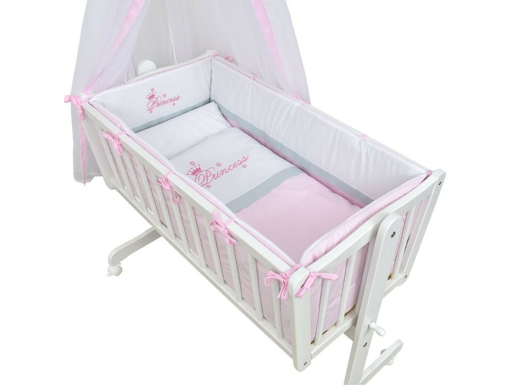 Dopřejte své malé princezně něžné a bezpečné prostředí pro klidný spánek. Luxusní souprava do kolébky v elegantní kombinaci bílé, jemně růžové a šedé barvy s romantickou výšivkou Princess vytvoří v dětském koutku kouzelnou atmosféru.