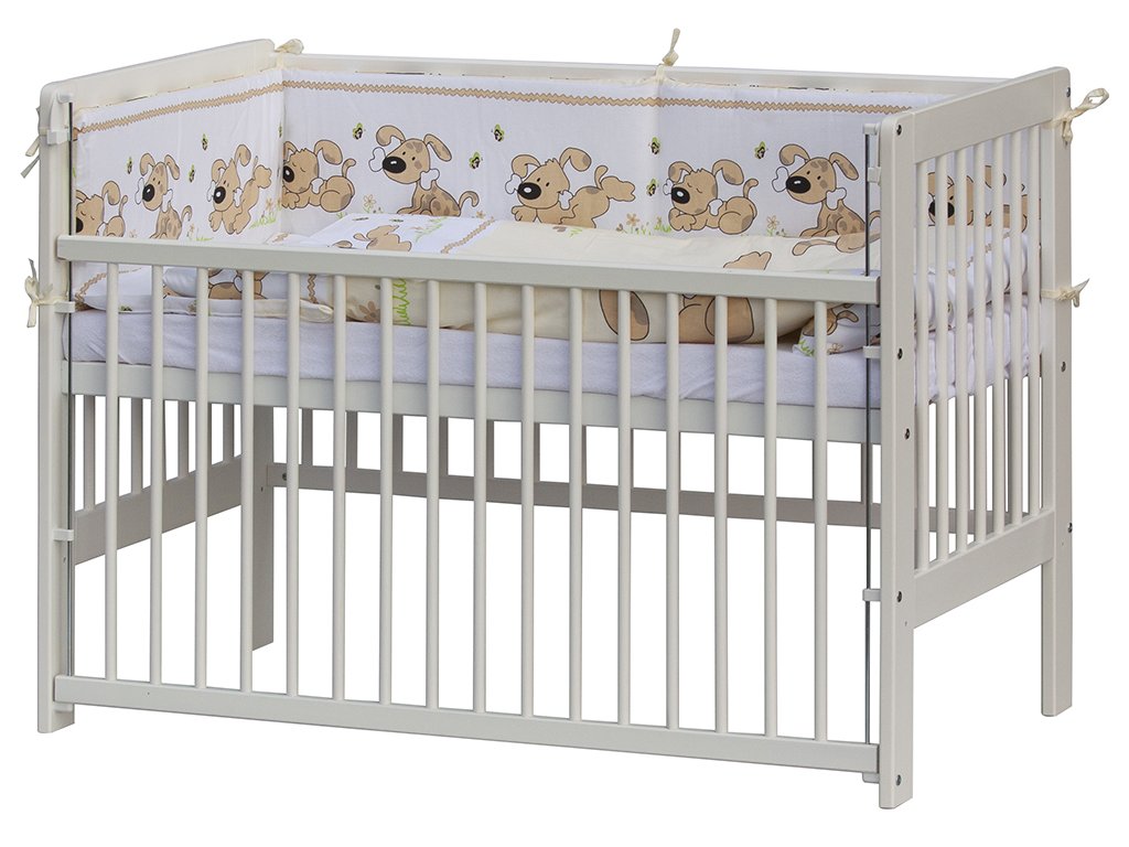 - bílá postýlka se stahovacím bokem 120x60cm, borovice bílá, 2 polohy roštu a s možností dokoupit kolečka pro snadnou manipulaci.