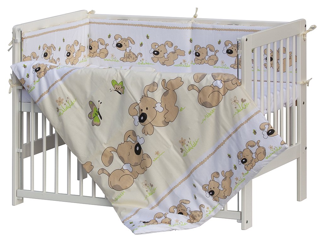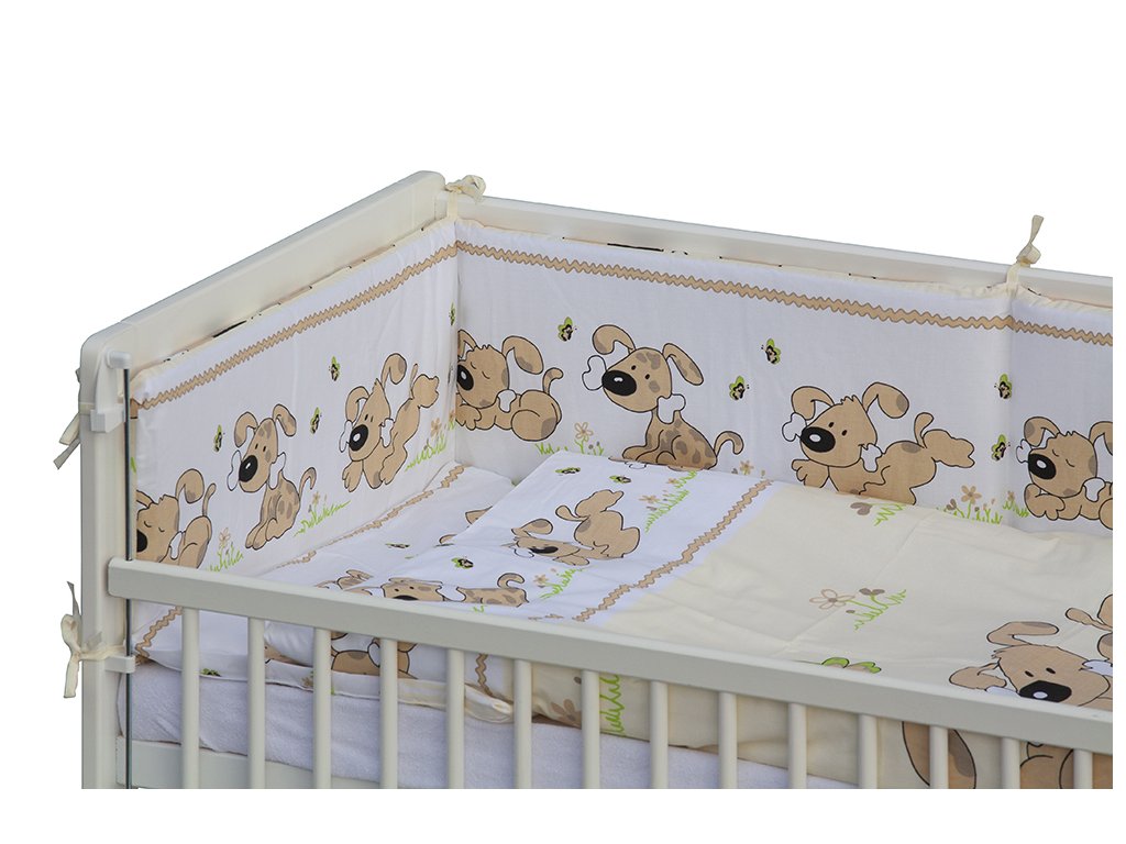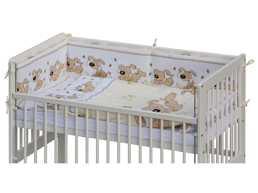 Kompletně vybavená bílá postýlka se stahovacím bokem, soupravou povlečení a mantinelu - kolekce JAPY béžová.. Součástí této postýlky je matrace, froté prostěradlo a výplně do povlečení