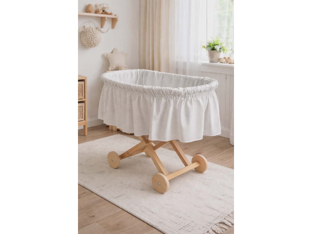 Košík je usazen na stabilním dřevěném podvozku s kolečky, díky kterým jej snadno přesunete přesně tam, kde ho potřebujete – ať už k posteli, do obývacího pokoje nebo k oknu. Tichý a plynulý pohyb zajišťuje maximální komfort bez rušení spánku miminka.
