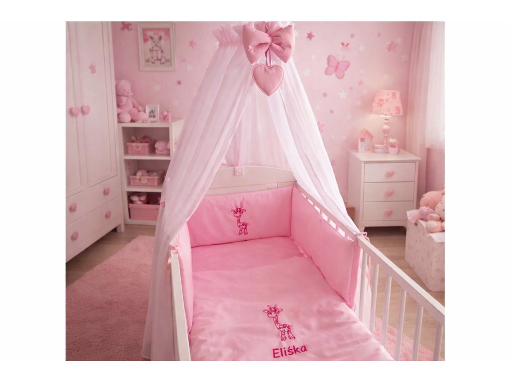 Vytvořte pro své miminko něžné a bezpečné místo ke spánku s touto elegantní ložní soupravou v jemném růžovém provedení. Souprava zaujme romantickým designem, kvalitním zpracováním a roztomilou výšivkou žirafky. Součástí je také lehký baldachýn, který dodá postýlce pohádkový vzhled a navodí klidnou atmosféru pro spánek.