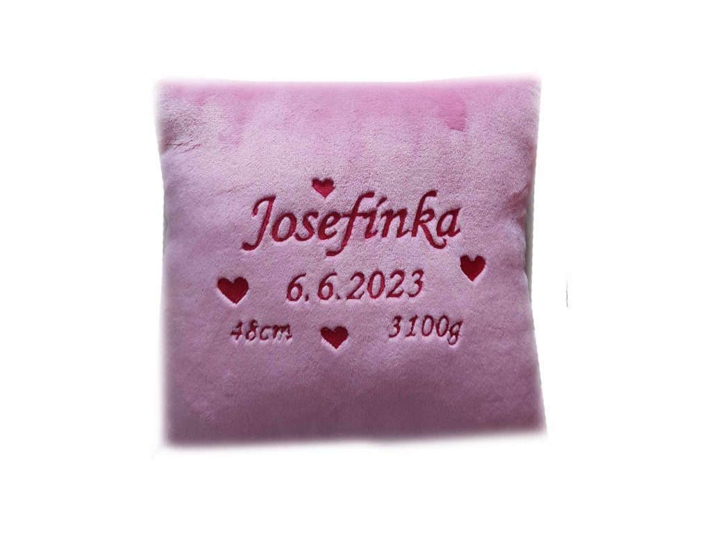 Nádherný heboučký polštářek s výšivkou srdíček, jména a data narození a mír na vaše přání