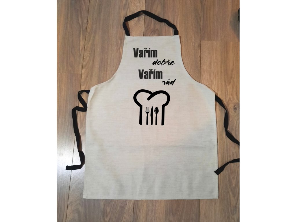 Originální Skandinávská kuchyňská zástěra s potiskem na Vaše přání a textem Vařím dobře, Vařím rád. Zástěra je světle krémová s jemnou strukturou připomínající len.
