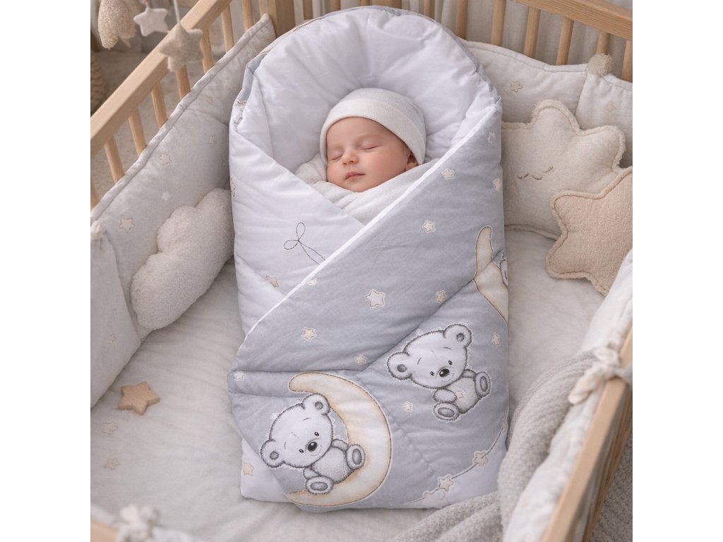 Dětská zavinovačka s jednoduchým zapínáním na suchý zip. Zavinovačka s roztomilým potiskem s medvídky a noční oblohou. Neutrálníšedá barva.